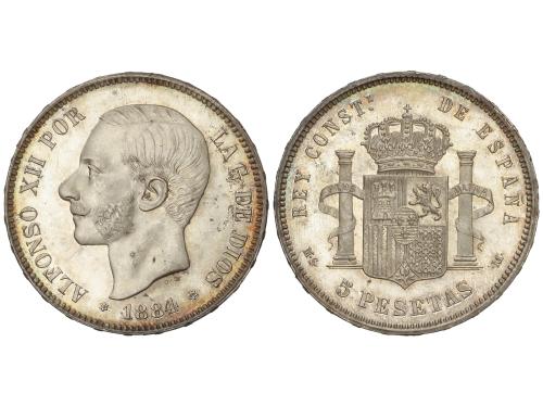 ALFONSO XII. 5 Pesetas. 1884 (*18-84). M.S.-M. EXTRAORDINARIO EJEMPLAR. Pleno brillo original. MUY RARA ASÍ. AC-57. SC.
