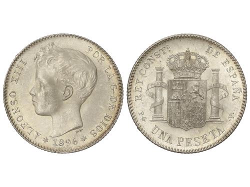 ALFONSO XIII. 1 Peseta. 1896 (*18-96). P.G.-V. (Infimas marquitas). Brillo original. AC-56. SC.