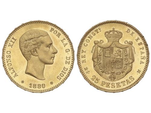 ALFONSO XII. 25 Pesetas. 1880 (*18-80). M.S.-M. 8,04 grs. AU (900). Brillo original. AC-79. EBC+.