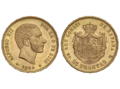 ALFONSO XII. 25 Pesetas. 1884 (*18-84). M.S.-M. 8,04 grs. AU (900). Restos de brillo. AC-89. EBC.