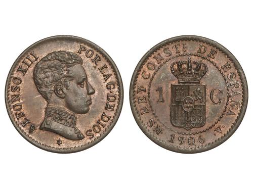 ALFONSO XIII. 1 Céntimo. 1906 (*6). S.M.-V. (Manchitas). Color y brillo originales. RARA Y MÁS ASÍ. AC-1. SC. Ex Aureo-Calicó Sub. 210 - 07 julio 2008, n. 588.