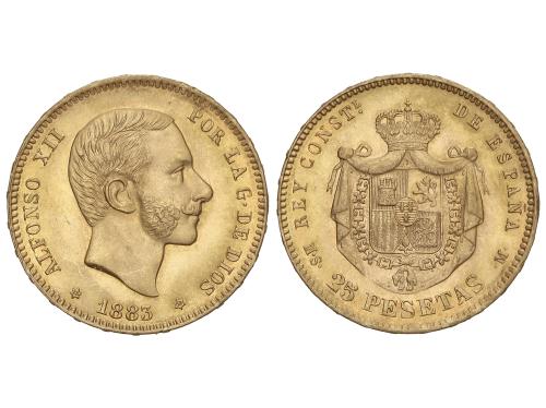 ALFONSO XII. 25 Pesetas. 1883 (*18-83). M.S.-M. 8,05 grs. AU (900). (Pequeños golpecitos en gráfila). Restos de brillo original. RARA y MÁS ASÍ. AC-87. EBC+.