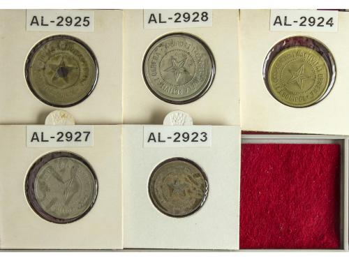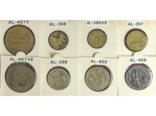 CATALUNYA. Lote 8 fichas 5 (2), 10 Cèntims y 2, 5 (2) y 25 Pessetes (2). COOPERATIVA LA UNIÓ. CANET DE MAR. Las de 25 y 5 Pesetas, con resello 1951. La L-407 emisión normal en latón y variante no catalogada en Br. A EXAMINAR. Alguna RARA. L-396, 397, 398, 405, 406, 407, 407 var. Metal. MBC a EBC+.