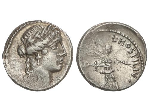 REPÚBLICA ROMANA. Denario. 489 a.C. HOSTILIA. L. Hostilius Saserna. Anv.: Cabeza de Venus a derecha. Rev.: L. HOSTILIVS. (SASERNA). Victoria caminando a derecha. 4,00 grs. AR. (Reverso algo descentrado). ESCASA. BMC-3989; Cal-625; Craw-448/1a; FFC-757; Se-5. EBC-.