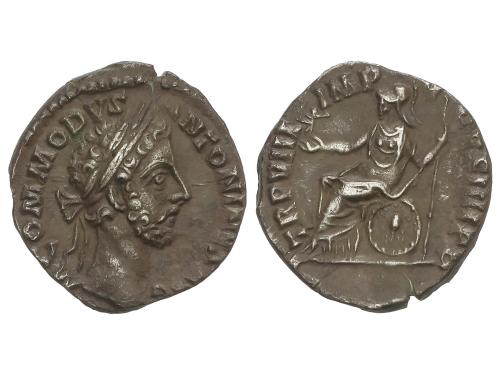 IMPERIO ROMANO. Denario. 180-183 d.C. CÓMODO. Anv.: M. COMMODVS ANTON. AVG. PIVS. Busto a derecha. Rev.: TR. P. VIII IMP. VI COS. IIII P. P. Victoria sentada con escudo. 2,60 grs. AR. Pátina oscura. C-888; RIC-57. MBC+.