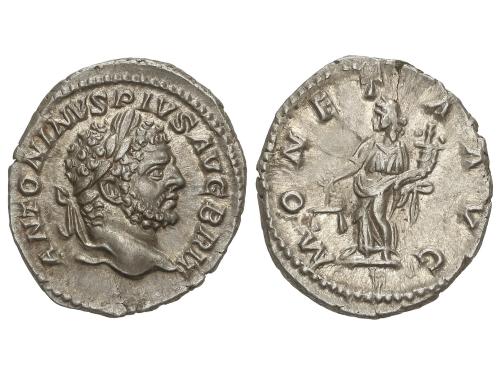IMPERIO ROMANO. Denario. 210-213 d.C. CARACALLA. Anv.: ANTONINVS IVS AVG. BRIT. Cabeza laureada a derecha. Rev.: MONETA AVG. Moneda en pie a izquierda. 2,97 grs. AR. Restos de brillo original. C-165; RIC-224. EBC.