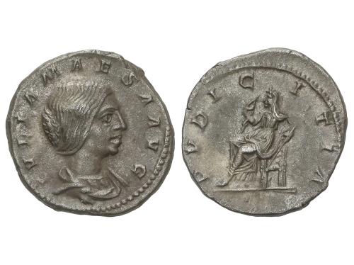IMPERIO ROMANO. Denario. 223 d.C. JULIA MAESA. Anv.: IVLIA MAESA AVG. Busto a derecha. Rev.: PVDICITIA. Pudicitia sentada a izquierda. 3,72 grs. AR. Pátina. C-36; RIC-268. MBC+.