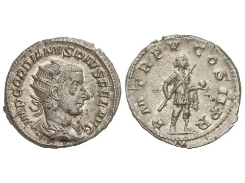 IMPERIO ROMANO. Antoniniano. 241-243 d.C. GORDIANO III. Rev.: P. M. TR. P. V COS. II P. P. Gordiano en pie a derecha con lanza y globo. 4,78 grs. AR. (Leves oxidaciones). Brillo original. C-266. SC-.