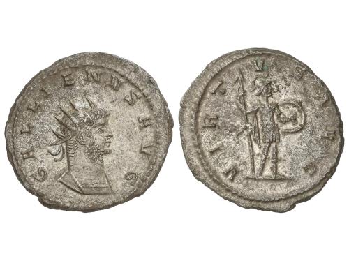 IMPERIO ROMANO. Antoniniano. 266-267 d.C. GALIENO. ANTIOQUÍA. Rev.: VIRTVS AVG. Marte en pie a derecha con lanza y apoyado en un escudo. 3,89 grs. Ve. Restos de brillo. C-1246; RIC-S669. EBC-.