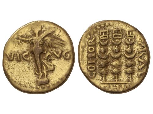 IMPERIO ROMANO. AE 17. 41 - 68 d.C. TIEMPOS DE CLAUDIO O NERÓN. PHILIPPI. MACEDONIA. Anv.: VIC. AVG. Victoria con corona y palma. Rev.: COHOR. (PRAE.) PHIL. Tres estandartes. 4,12 grs. AE. Conmemorando la victoria de las tropas de Augusto sobre los asesinos de Julio Cesar en Philippi. (Sobredorada). SNG Copenhagen 305; RPC-1651. (MBC+).