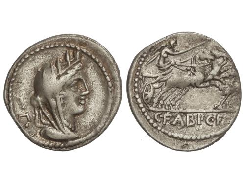 REPÚBLICA ROMANA. Denario. 104 a.C. FABIA. C. Fabius C.f. Hadrianus. Anv.: Cabeza de Cibeles a derecha, detrás letra griega. Rev.: Victoria en biga a derecha, debajo cigüeña. En exergo: C. FABI. C.F. 3,85 grs. AR. (Leves golpecitos). Cal-574; FFC-702; Se-15; S.Domingo-252. MBC+/MBC.