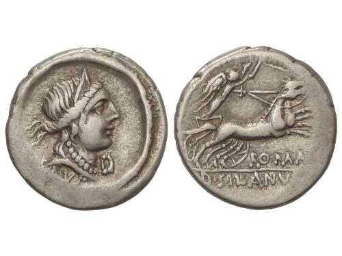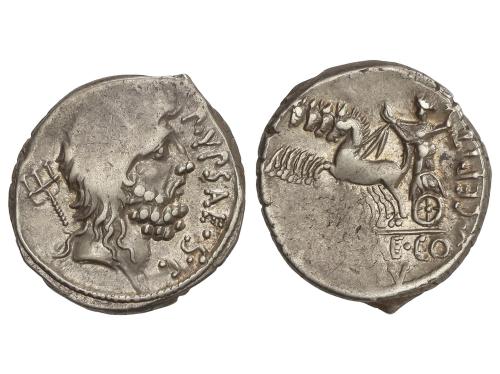 REPÚBLICA ROMANA. Denario. 85 a.C. JULIA. L. Julius Bursio. Anv.: Cabeza de Apolo Vejovis a derecha, detrás tridente y símbolo. Rev.: Victoria en cuadriga a derecha, debajo FI letras. En exergo: L. IVLI. BVRSIO. 4,04 grs. AR. (Leves oxidaciones). BMC-2549-96; Cal-636; Craw-352/1c; FFC-769; Se-5b; S.Domingo-299b. MBC+.