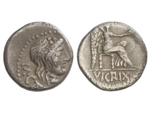 REPÚBLICA ROMANA. Denario. 81 a.C. MARIA. C. Marius C.f. Capito. Anv.: Cabeza laureada de Ceres a derecha, encima número CIIII, delante símbolo, detrás CAPIT. Rev.: Colono con bueyes a izquierda, encima número CIIII. En exergo: C. MARI. C.F. / (S.C). 3,91 grs. AR. BMC-2855-90; Cal-968; Craw-378/1c; FFC-901; Se-9. MBC.