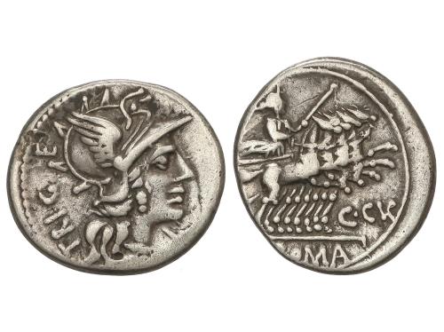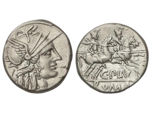 REPÚBLICA ROMANA. Denario. 121 a.C. PLUTIA. C. Plutius. Anv.: Cabeza de Roma a derecha, detrás X . Rev.: Dióscuros a caballo a derecha., debajo C.PLVTI, en exergo ROMA en tablilla. 3,92 grs. AR. BMC-454; Cal-1136; Craw-278-1; FFC-1009; Se-1. EBC- .