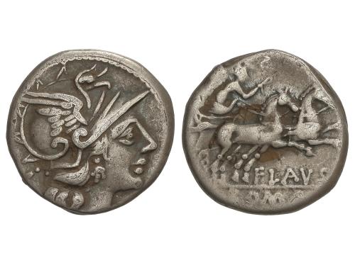 REPÚBLICA ROMANA. Denario. 150 a.C. DECIMIA. Decimius Flavus. Anv.: Cabeza de Roma a derecha, detrás X . Rev.: Diana en biga derecha, debajo FLAVS, en exergo ROMA. 3,74 grs. AR. BMC-848; Cal-538; Craw-207-1; FFC-673; Se-1. MBC/MBC-.