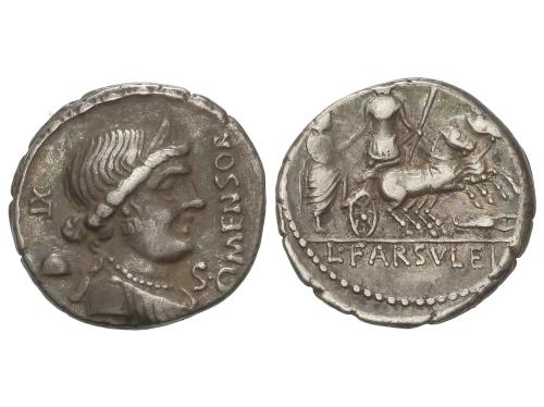 REPÚBLICA ROMANA. Denario. 75 a.C. FARSULEIA. L. Farsuleius Mensor. Anv.: Busto diademado de la Libertad a derecha, entre IX, gorro frigio y MENSOR, SC bajo el mentón . Rev.: Guerrero en biga a derecha, con otro personaje subiendo al carro. Escorpión debajo los caballos. En exergo L.FARSULEI. 3,89 grs. AR. Pátina. BMC-3306-11; Cal-578; Craw-392-1a; FFC-707; Se-1. MBC+.