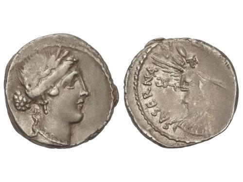 REPÚBLICA ROMANA. Denario. 48 a.C. HOSTILIA. L. Hostilius Saserna. Anv.: Cabeza de Venus a derecha . Rev.: Victoria caminando a derecha, detrás SASERNA. 3,90 grs. AR. (Reverso algo descentrado). BMC-3989; Cal-625; Craw-448-1a; FFC-757; Se-5. MBC+/EBC-.