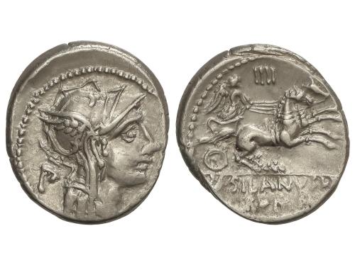 REPÚBLICA ROMANA. Denario. 91 a.C. JUNIA. D. Junius Silanus L.f. Anv.: Cabeza de Roma a derecha, detrás P . Rev.: Victoria en biga a derecha, encima llll, en exergo D.SILANVS.L.F/ROMA. 3,97 grs. AR. BMC-1772-39; Cal-869; Craw-337-3a; FFC-789; Se-15. EBC-.