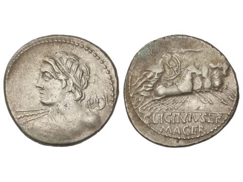 REPÚBLICA ROMANA. Denario. 84a.C. LICINIA. C. Licinius L, f. Macer. Anv.: Cabeza de Apolo Vejovis a izquierda. Rev.: Minerva en cuadriga a derecha, en exergo C. LICINIVS. L.F/MACER. 3,79 grs. AR. BMC-2467; Cal-889; Craw-354-1; FFC-803; Se-16. EBC-.