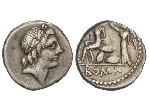 REPÚBLICA ROMANA. Denario. 91 a.C. POBLICIA. Caius Poblicius Malleolus. Anv.: Cabeza laureada de Apolo a derecha. Rev.: Roma sentada a izquierda coronada por la Victoria. En exergo: ROMA. 3,91 grs. AR. (Reverso algo descentrado). ESCASA. BMC-694; Cal-1143; Craw-335-2; FFC-1016; Se-4. MBC.