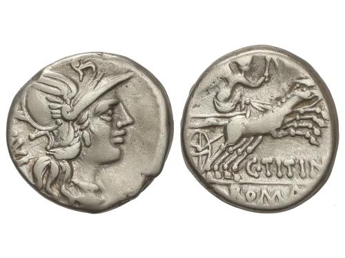 REPÚBLICA ROMANA. Denario. 141 a.C. TITINIA. C. Titinius Gadacus. Anv.: Cabeza de Roma a derecha, detrás XVI. Rev.: Victoria en biga a derecha, debajo C. TITIN. En exergo: ROMA. 3,61 grs. AR. ESCASA. FFC-1145. MBC+/MBC.