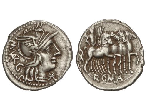 REPÚBLICA ROMANA. Denario. 142 a.C. CURIATIA. Caius Curiatius Trigeminus. Anv.: Cabeza de Roma a derecha, detrás TRIGE . Rev.: Juno en cuadriga a derecha., debajo C.CVR. En exergo ROMA. 3,81 grs. AR. BMC-891; Cal-531; Craw-223-1; FFC-666; Se-1. MBC+/MBC.