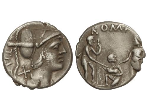REPÚBLICA ROMANA. Denario. 62 a.C. AEMILIA. Paullus Aemilius Lepidus. Anv.: Cabeza velada y diademada de Concordia a derecha. PAVLLVS LEPIDVS CONCORDIA. Rev.: L. Aemilius y Perseo de Macedonia con sus dos hijos en medio trofeo, encima: TER. En exergo: PAVLLVS. 4,02 grs. AR. BMC-3373; Cal-91; Craw-415/1; FFC-126; Se-10; S.Domingo-14. EBC-/MBC+.