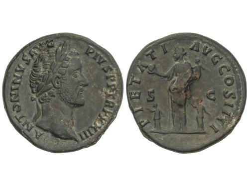IMPERIO ROMANO. Sestercio. 159 d.C. ANTONINO PÍO. Anv.: ANTONINVS AVG. PIVS P. P. TR. P. XXIII. Busto laureado a derecha. Rev.: PIETATI AVG. COS. IIII. Piedad en pie a izquierda con globo y tres niños. 23,22 grs. AE. (Realzada, pequeñas oxidaciones). C-620. MBC+.