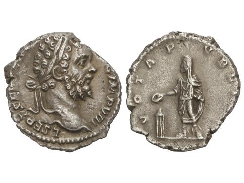 IMPERIO ROMANO. Denario. 196-197 d.C. SEPTIMIO SEVERO. Anv.: L. SEPT. SEV. PERT. AVG. IMP. VIII. Cabeza laureada a derecha. Rev.: VOTA PVBLICA. Septimio Severo en pie a izquierda con pátera sacrificando sobre un altar. 3,14 grs. AR. C-777; RIC-96a. EBC-/MBC+.