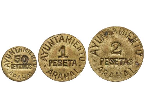 EMISIONES LOCALES GUERRA CIVIL. Serie 3 monedas 50 Céntimos, 1 y 2 Pesetas. ARAHAL. Serie completa. AC-40/42; HG-230/3. MBC+ a EBC.