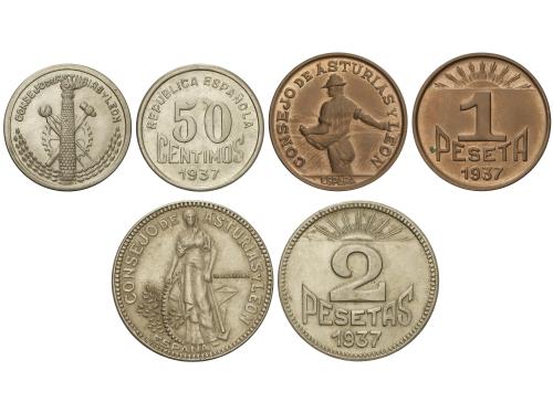 EMISIONES LOCALES GUERRA CIVIL. Serie 3 monedas 50 Céntimos, 1 y 2 Pesetas. 1937. CONSEJO DE ASTURIAS Y LEÓN. AC-8/10; HG-197/99; Vti-L1/L3. EBC- a SC-.