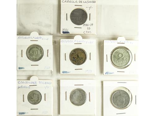 EMISIONES LOCALES GUERRA CIVIL. Lote 7 monedas 10 Céntimos a 2 Pesetas. 1937. Asturias y León(3), 50 Ctos Santander, Palencia y Burgos, Euzkadi(2) y Cazalla de la Sierra. A EXAMINAR. MBC- a EBC.