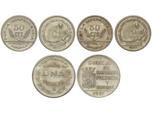 EMISIONES LOCALES GUERRA CIVIL. Lote 3 monedas 50 Céntimos. 1937. CONSEJO DE SANTANDER, PALENCIA Y BURGOS. 50 Céntimos con y sin PJR. AC-33, 34, 35. EBC- a EBC.