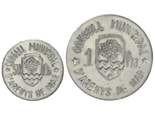 EMISIONES LOCALES GUERRA CIVIL. Serie 2 monedas 50 Cèntims y 1 Pesseta. C.M. d´ARENYS DE MAR. AC-6/7; Vti-L18/L19. SC.