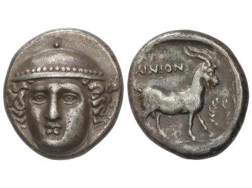 MONEDAS GRIEGAS. Tetradracma. 400-398 a.C. AINOS. Anv.: Cabeza de Hermes con pétaso de frente . Rev.: AINION. Cabra a derecha, delante corona de laurel. 15,43 grs. Ligera pátina oscura. RARA. HGC 3.2-1278. MBC+/MBC. Ex Gorny & Mosch 100 - 20 noviembre 1999, n. 1017.