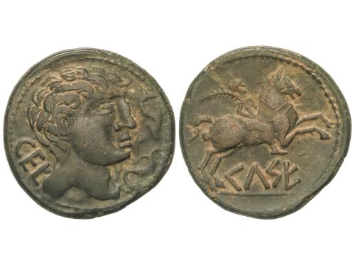 MONEDAS HISPÁNICAS. As. 120-50 a.C. CELSE (VELILLA DE EBRO, Zaragoza). Anv.: Cabeza masculina a derecha, delante delfines, detrás CEL. Rev.: Jinete con palma a derecha, debajo leyenda ibérica. 20,15 grs. AB-773; ACIP-1490. MBC+.