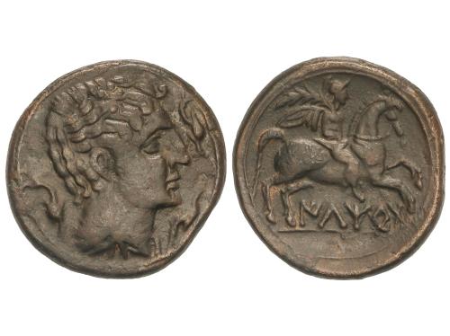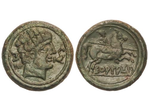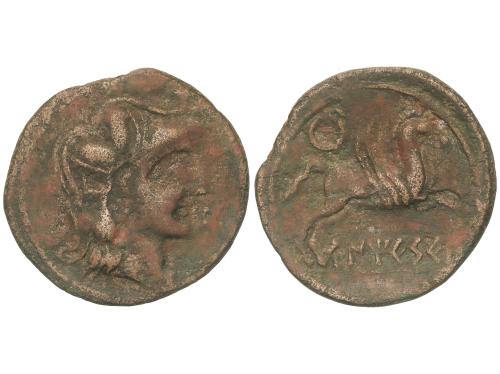MONEDAS HISPÁNICAS. As. 130-90 a.C. UNTICESCEN (L'ESCALA EMPURIES, Girona). Anv.: Cabeza de Palas a derecha. Rev.: Pegaso a derecha, encima láurea, debajo leyenda ibérica. 12,14 grs. ESCASA. AB-1210; ACIP-999. MBC.