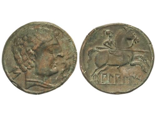 MONEDAS HISPÁNICAS. As. 120-20 a.C. ECUALACOS (ZONA DE SORIA, Guadalajara). Anv.: Cabeza masculina a derecha, delante delfín, detrás letras ibéricas Se. Rev.: Jinete con lanza a derecha, debajo leyenda ibérica. 15,06 grs. (Leves oxidaciones). Pátina verde. AB-970; ACIP-1846. MBC+.