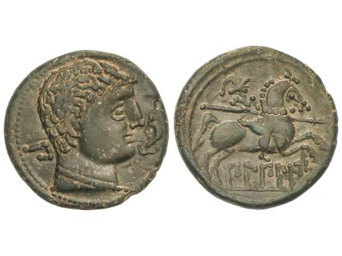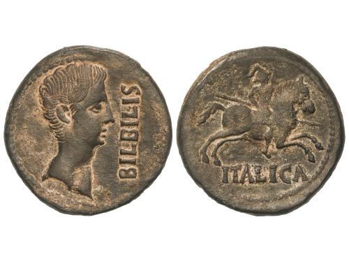 MONEDAS HISPÁNICAS. As. 30-20 a.C. ACUÑACIONES DE TRANSICIÓN. BILBILIS (CALATAYUD, Zaragoza). Anv.: Cabeza de Augusto a derecha, delante BILBILIS. Rev.: Jinete con lanza a derecha, debajo ITALICA. 15,08 grs. Pátina. ESCASA. AC-270. EBC-.