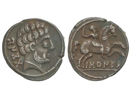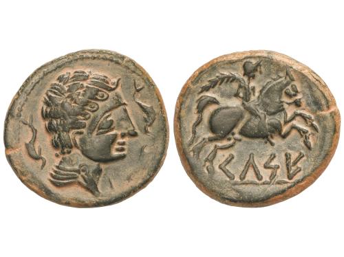 MONEDAS HISPÁNICAS. As. 120-80 a.C. CAISESA (Zona de Soria-Guadalajara). Anv.: Cabeza masculina a derecha, detrás letras ibéricas: BaIS, delante delfín. Rev.: Jinete con lanza a derecha, debajo leyenda ibérica sobre línea: CaISESA. 9,68 grs. Pátina. MUY RARA. AB-401; ACIP-1819. MBC-. Ex Vico - 4 marzo 2010, n. 72.