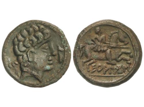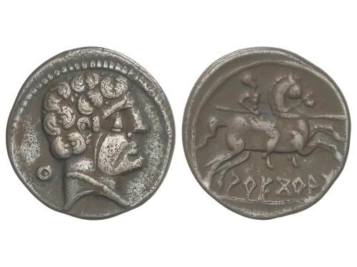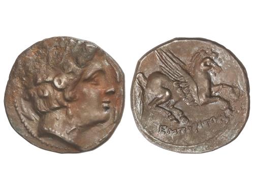 MONEDAS HISPÁNICAS. Dracma. 200-110 a.C. EMPORITON (SANT MARTÍ D´EMPÚRIES, Girona). Anv.: Cabeza de Perséfone a derecha, rodeada de tres delfines. Rev.: Pegaso-Crisaor a derecha, debajo leyenda. 4,73 grs. (Leves oxidaciones). Pátina de colección antigua. AB-1108; ACIP-195. MBC+.