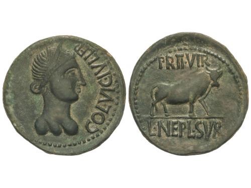 MONEDAS HISPÁNICAS. As. 50-30 a.C. ACUÑACIONES DE TRANSICIÓN. CELSA (VELILLA DE EBRO, Zaragoza). Anv.: COL. VIC. IVL. LEP. Busto femenino a derecha. Rev.: PR. II VIR. L. NEP. L. SVR. Toro a derecha. 14,66 grs. Pátina verde oscura. AB-795; ACIP-1494. MBC+.