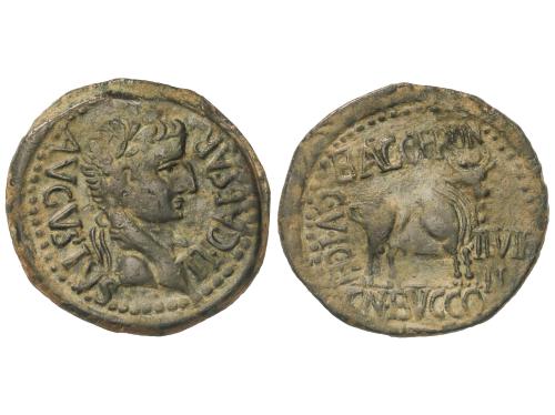 MONEDAS HISPÁNICAS. As. 14-37 d.C. ÉPOCA DE TIBERIO. CELSE (VELILLA DE EBRO, Zaragoza). Anv.: TI. CAESAR AVGVSTVS. Cabeza laureada a derecha. Rev.: BACC. FRONT. CN. BVCCO. II VIR. II C. V. I. CEL. Toro a derecha. 12,83 grs. Pátina. AB-819; ACIP-3170. EBC-.