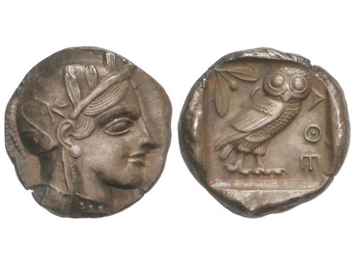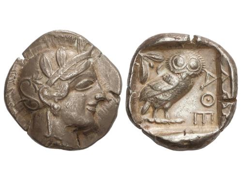 MONEDAS GRIEGAS. Tetradracma. 454-404 a.C. ATENAS. ÁTICA. Anv.: Cabeza de Atenea a derecha, con casco adornado con rama de olivo. Rev.: AOE. Lechuza en pie a derecha, detrás rama de olivo y creciente, todo dentro de cuadrado incuso. 17,16 grs. Pátina de colección antigua. BUEN EJEMPLAR. HGC 4-1597; SNG Copenhague-31. EBC.