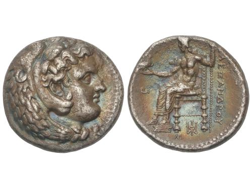 MONEDAS GRIEGAS. Tetradracma. 337-323 a.C. ALEJANDRO MAGNO. BABILONIA. Anv.: Cabeza de Hércules con piel de león a derecha. Rev.: Zeus entronizado a izquierda, llevando águila y cetro, debajo monograma, delante tridente y M. 17,02 grs. Pátina irisada. Price-3635. EBC-.