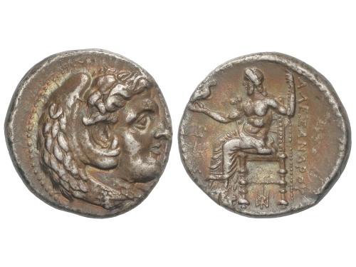 MONEDAS GRIEGAS. Tetradracma. 336-323 a.C. ALEJANDRO MAGNO. BABILONIA. Anv.: Cabeza de Hércules con piel de león a derecha. Rev.: Zeus entronizado a izquierda, delante astrágalo, debajo monograma y M. 16,37 grs. Pátina irisada. Price-3610. EBC-.