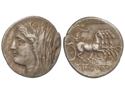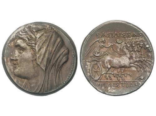 MONEDAS GRIEGAS. 16 Litra. 240-216 a.C. HIERON II y SUS DESCENDIENTES. SIRACUSA.SICILIA. Anv.: Cabeza diademada y velada de Philistis a izquierda, detrás estrella. Rev.: ΒΑΣΙΛΙΣΣΑΣ KI ΦΙΛΙΣΤΙΔΟΣ. Nike conduciendo cuadriga al galope a derecha, encima media luna, debajo espiga. 13,63 grs. Bonito tono de colección antigua con pátina. HGC 2-1554; Se-998 sim. EBC.