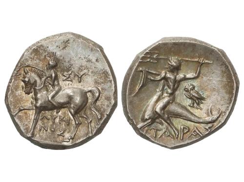 MONEDAS GRIEGAS. Didracma (Nomos). 272-240 a.C. CALABRIA. TARENTO. Anv.: Jinete a izquierda, coronando al caballo. Rev.: Taras a izquierda sobre delfín, con tridente, detrás lechuza. 6,42 grs. Bonita pátina pátina irisada. MUY BUEN REVERSO. HGC 1-889; HN Italy-1025. EBC.