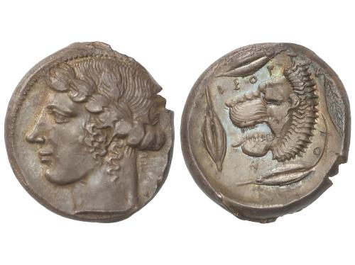 MONEDAS GRIEGAS. Tetradracma. 466-422 a.C. LEONTINI. SICILIA. Anv.: Cabeza de Apolo laureado a izquierda. Rev.: LEONTINON. Cabeza de león a izquierda, alrededor cuatro granos de trigo. 17,27 grs. Bonita pátina de colección antigua. BELLA. HGC 2-671; SNG ANS-257. EBC.