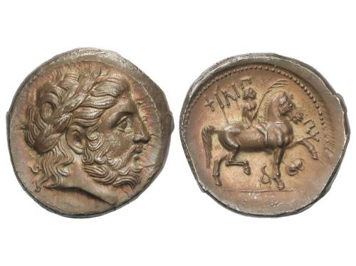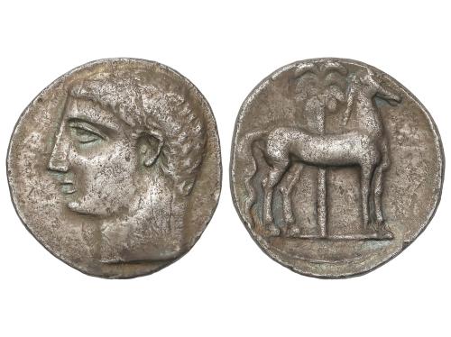 MONEDAS HISPÁNICAS. Shekel. ACUÑACIONES HISPANO-CARTAGINESAS. CARTAGO NOVA. Anv.: Cabeza masculina de tamaño grande a izquierda. Rev.: Caballo a derecha, detrás palmera. 7,07 grs. Leve pátina irisada. RARA. ACIP-606; AB-547; Vill-67. MBC+.